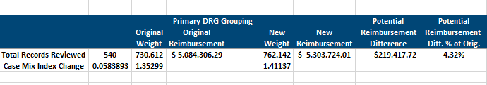 Overall Potential Reimbursement Impact: Potential increase of $2,552,125.32 when extrapolated across the 2018 inpatient discharges (using 6,282 as annual number of accounts). CMI based on accounts reviewed not overall casemix. Reimbursment based on $6,958.97 facility base rate.