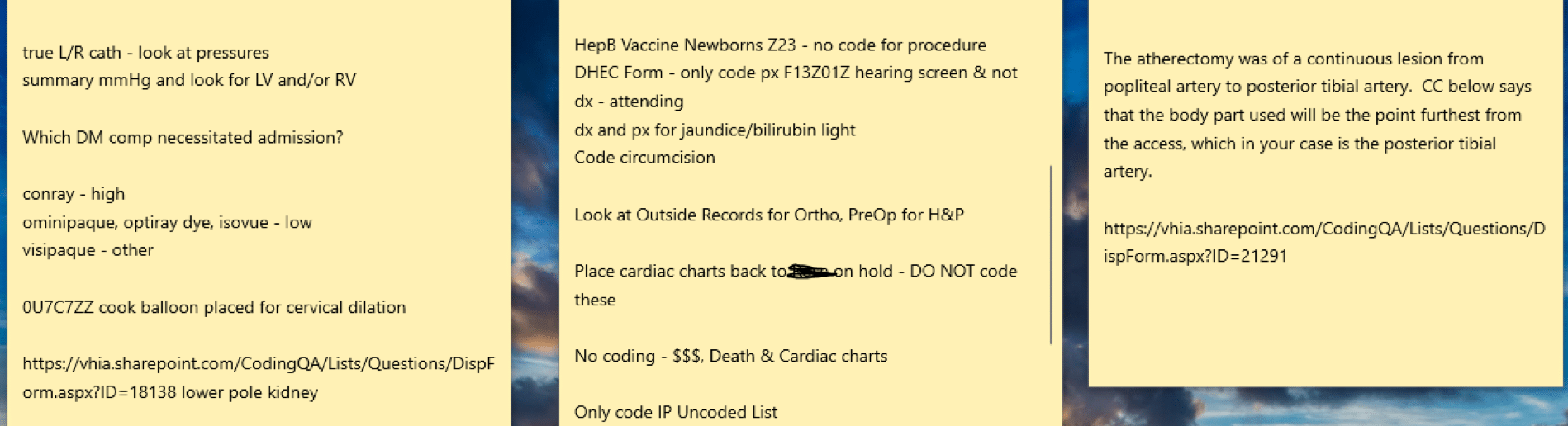 If I know there is a chart that I will have questions on, I open SharePoint and put in the main terms or terms that will help narrow down the search. I read what relates to what I am coding to familiarize myself with the chart I am about to code. This all helps to make sure I am selecting the correct principle diagnoses.
